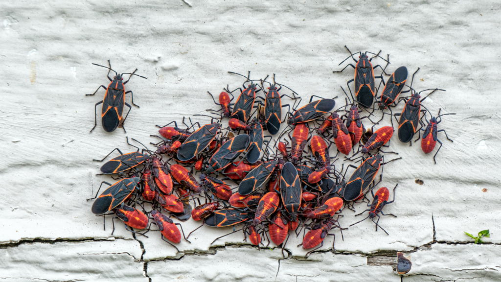 What you’ll see: groups of these insects clustering on the sunny side of buildings, doorframes, or window trim. They’re mostly a nuisance — but when crushed they can stain or give off an unpleasant smell. These bugs often spend the winter tucked into cracks and crevices around exterior siding, window frames, and soffits.